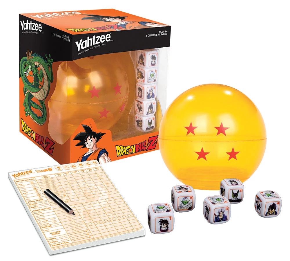 Get ready to face off with America’s #1 dice game. The four star Dragon Ball cup is the key to the game. Use custom dice featuring Goku, Gohan, Vegeta, Trunks, Piccolo and Cell to see who is the most powerful. Roll your way to victory with classic  dice combinations like Full House, Large Straight and Five of a Kind!