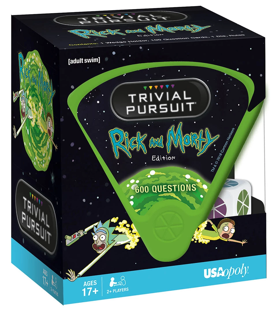 Rick and Morty Trivial Pursuit allows fans of the hit television series to test their knowledge from 600 questions relating to Frienemies, Technology & Science, Locations, Rick and the Family, History & Events and a Wubalubadubdub Wild Card category. Categories include: Frienemies, Technology & Science, Locations, Rick and the Family, History & Events, Wubalubadubdub