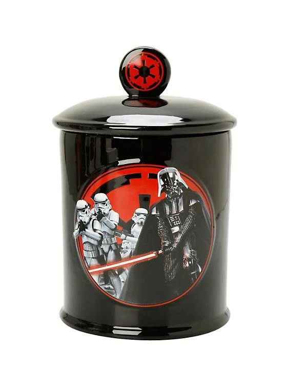 Ceramic cookie jar with Darth Vader and Stormtroopers design. Interior reads “Come to the dark side, we have cookies.”